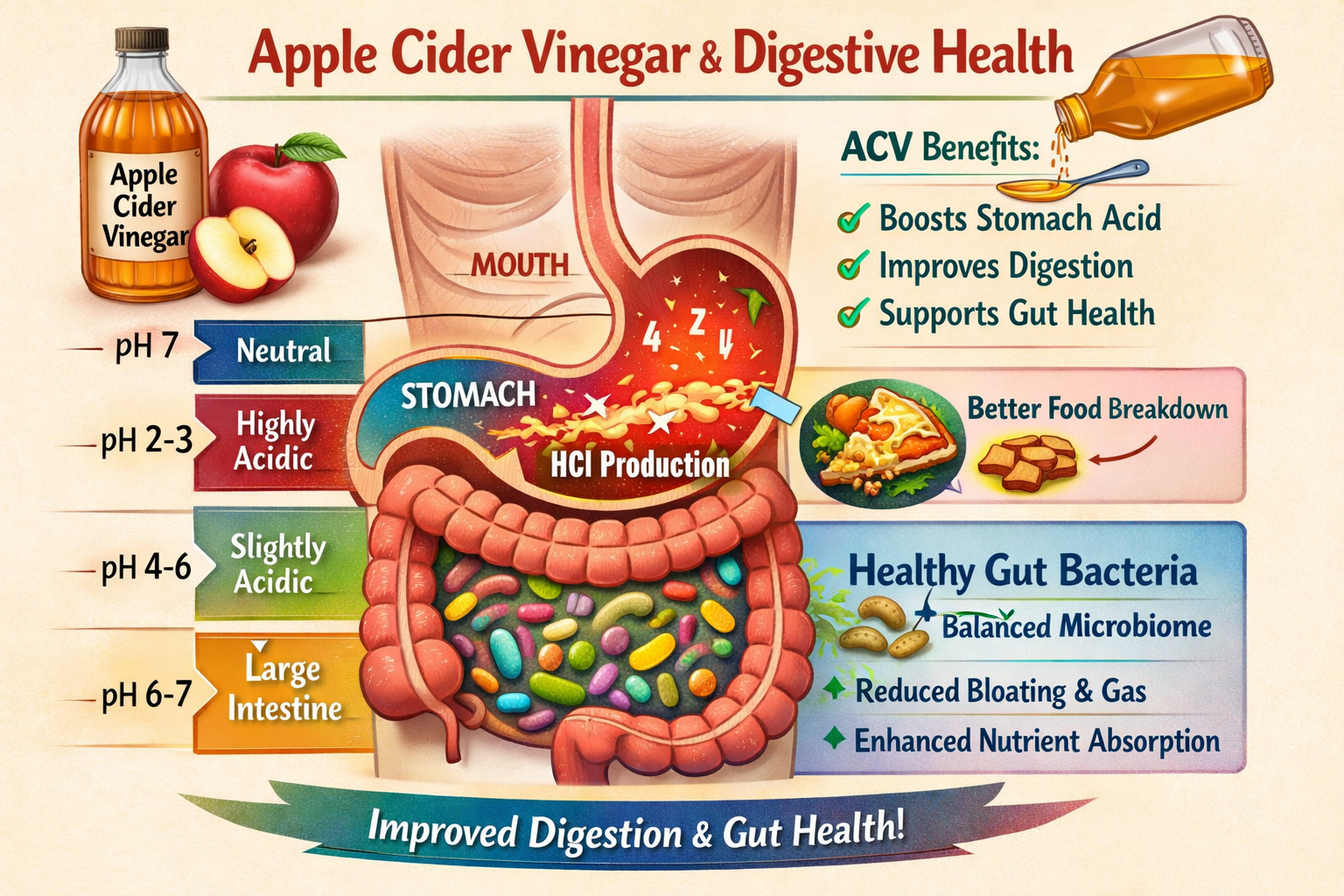 Apple cider vinegar acts as a natural digestive aid through multiple pathways: