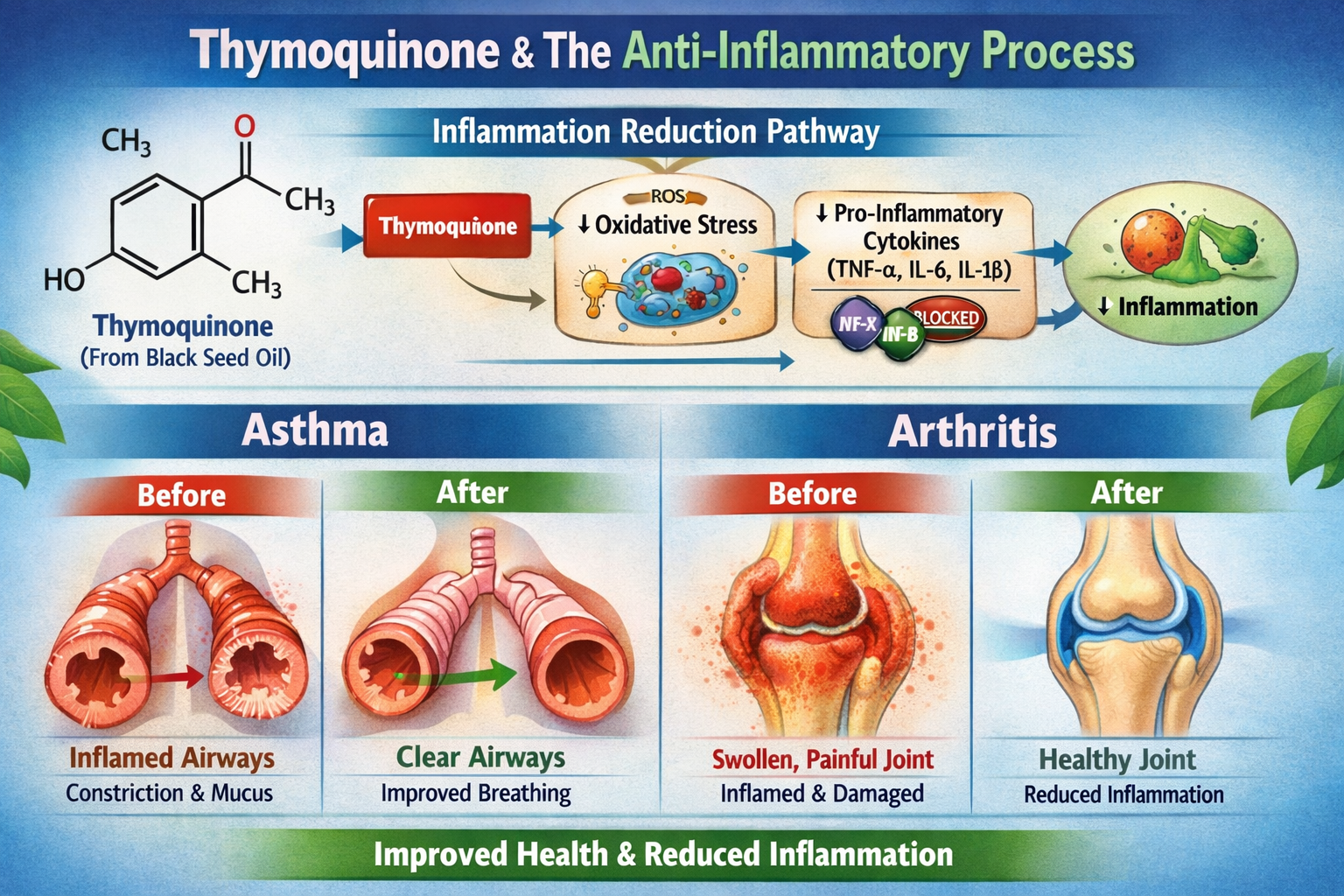 - Thymoquinone: Primary anti-inflammatory and antioxidant agent