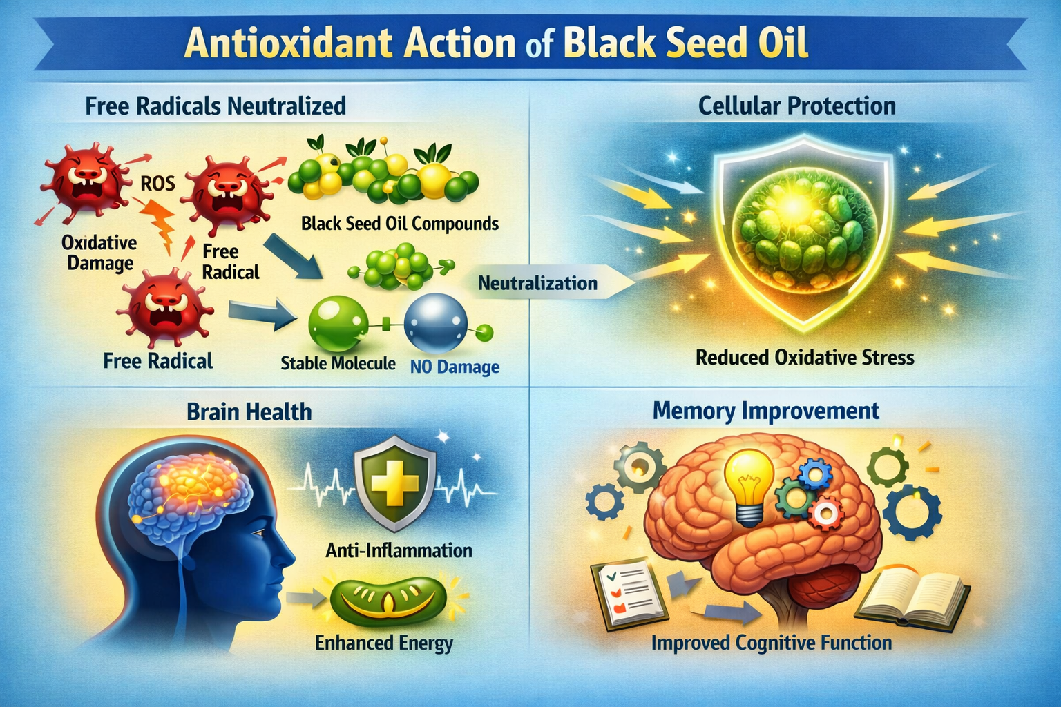 Free radical damage accelerates aging and contributes to chronic diseases. Black seed oil provides robust antioxidant protection through multiple mechanisms, helping shield cells from oxidative stress.
