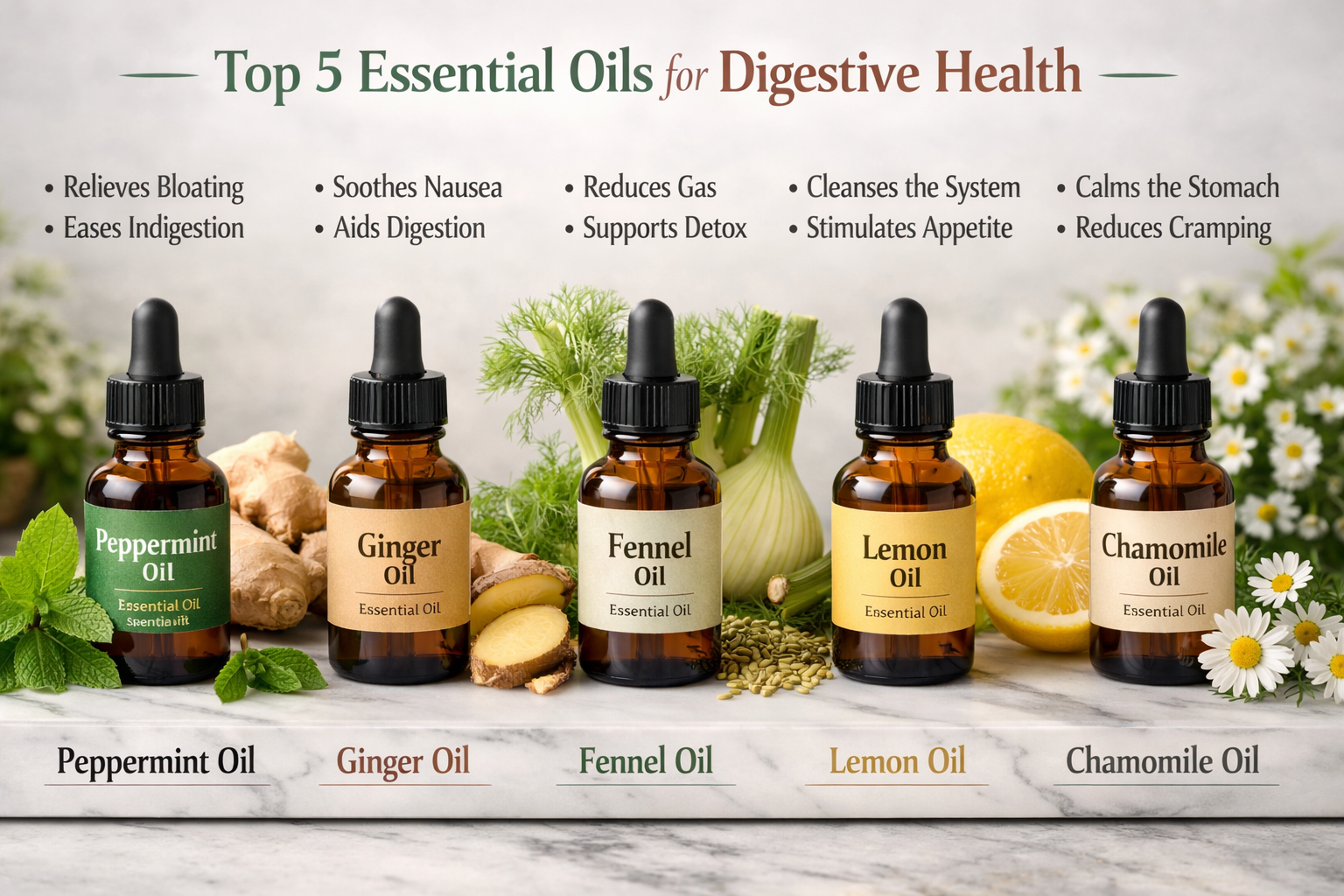• Peppermint and ginger oils are the most researched and effective essential oils for digestive support, particularly for nausea, bloating, and stomach discomfort