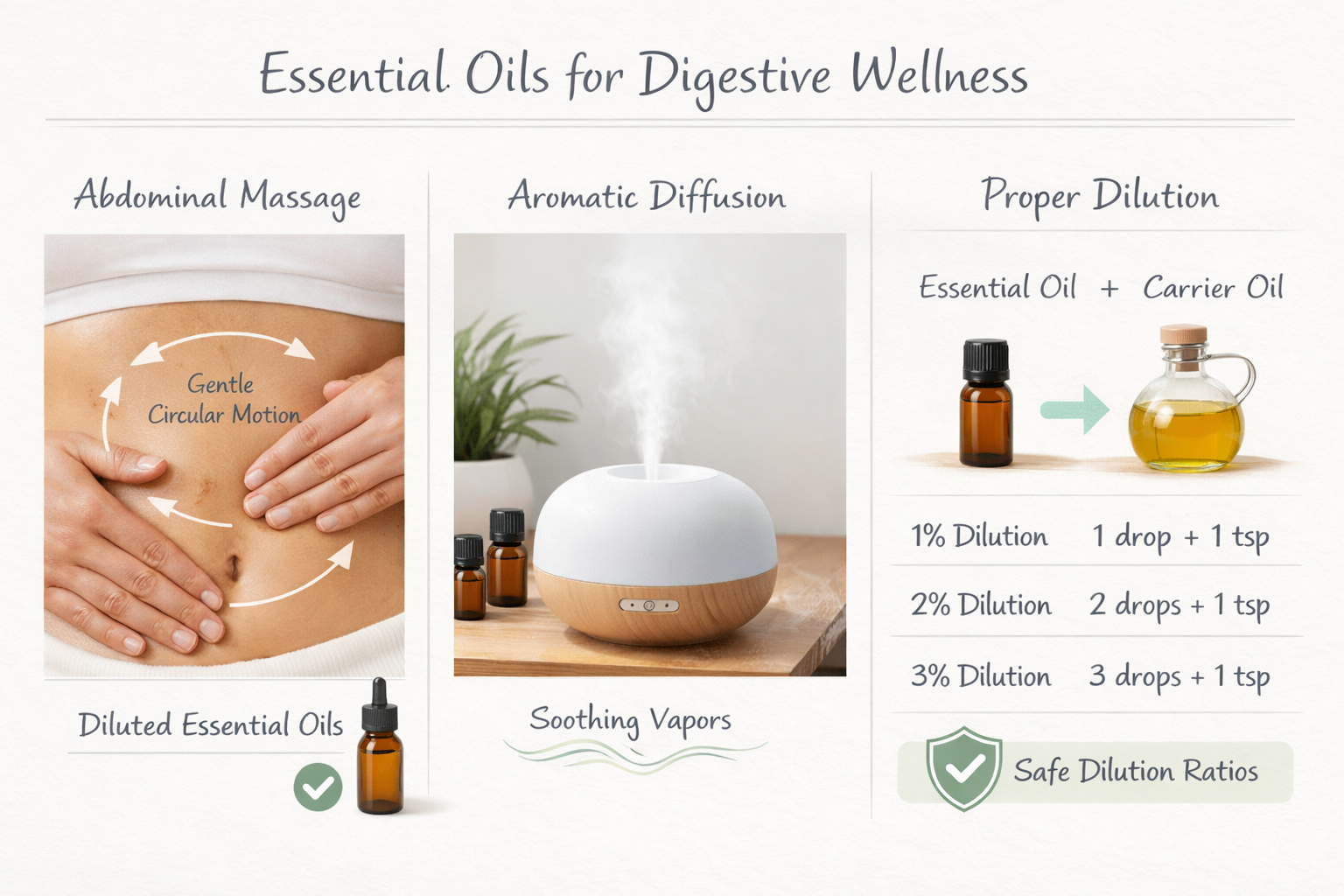 • Individual responses vary – start with small amounts and monitor your body’s reaction to find the best oils for your specific digestive needs