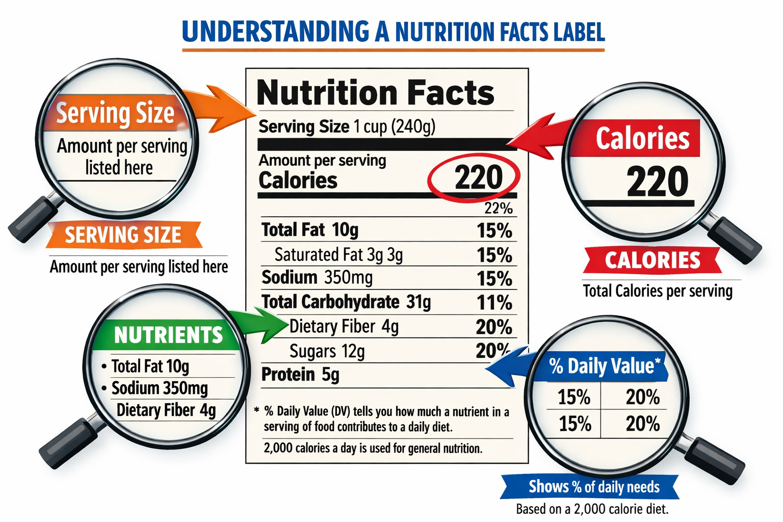 • Percent Daily Values (%DV) provide context—5% or less is low, 20% or more is high for most nutrients